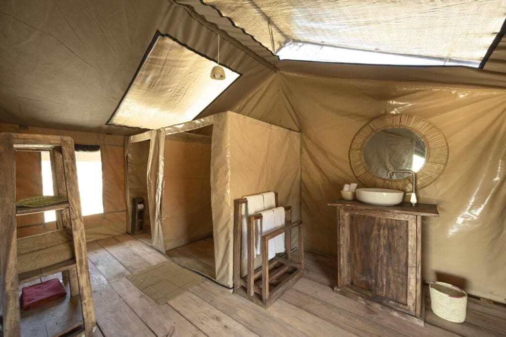 Ein Kingsize-Bett (180 x 200) und zwei Etagenbetten (90 x 200) | Voll ausgestattetes Badezimmer mit Dusche | Sitzbereich innen | Standventilator | Ladepunkte für Mobiltelefone und Kameras | Safe | Qualitätsmatratzen und Bettwäsche | Moskitonetz | Terrasse
