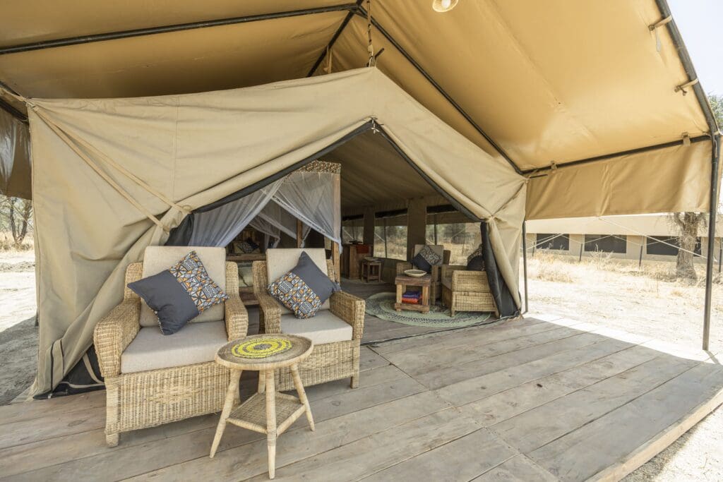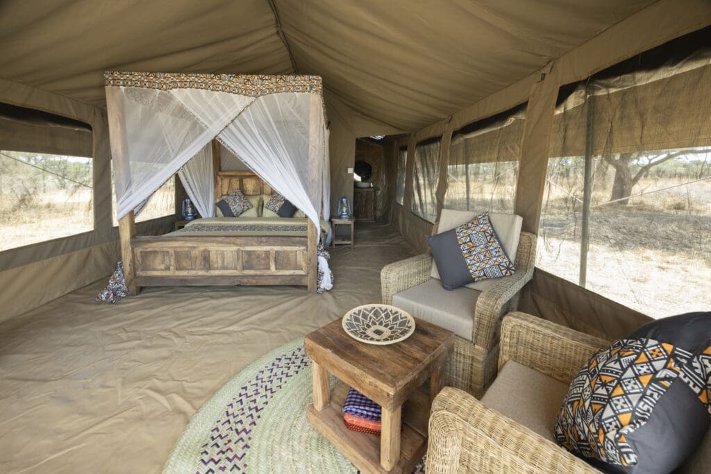Wünschen Sie sich etwas mehr Luxus und Komfort während Ihres Aufenthalts in der südlichen Serengeti? Dann entscheiden Sie sich für das Luxus-Glamping-Zelt. Dieses Zelt ist etwas größer, verfügt über ein Kingsize-Bett und ein Einzelbett. Sie können sich auch im Sitzbereich drinnen und draußen entspannen. Im Badezimmer finden Sie eine begehbare Dusche, eine europäische Toilette und ein Waschbecken. Ein zusätzliches Einzelbett kann auf Anfrage hinzugefügt werden.