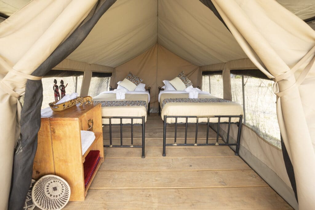 Suchen Sie mehr Abenteuer und das echte Campinggefühl? Dann wählen Sie das Safarizelt. Dieses kleine, aber robuste Zelt besteht aus zwei Einzelbetten. Sehr komfortabel und schön hergerichtet. Draußen haben Sie einen kleinen Sitzbereich, der perfekt ist, um die vorbeiziehenden Wildtiere zu beobachten. Die Safarizelte verfügen über Gemeinschaftstoiletten und Warmwasserduschen.