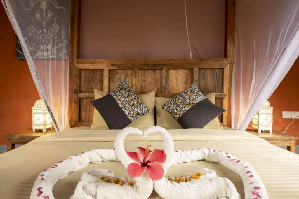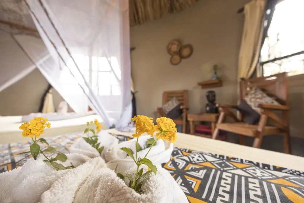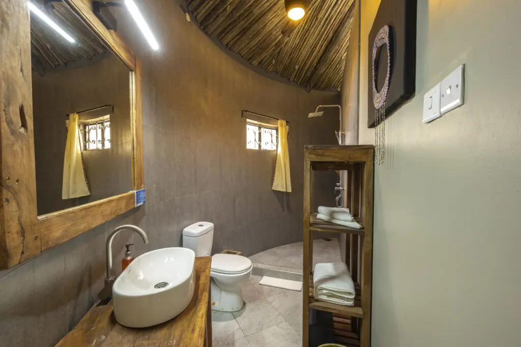 Deze ruime ronde luxury kamers zijn ingericht met een tweepersoonsbed en typische Afrikaanse accessoires. Een extra eenpersoonsbed kan op verzoek worden bijgeplaatst. De badkamer heeft een wastafel, inloopdouche en toilet, die erg ruim zijn opgezet. Ook heb je een heerlijke zithoek, een kaptafel en een bagagerek. Kortom, een erg fijne kamer om één of meerdere nachten in te overnachten.