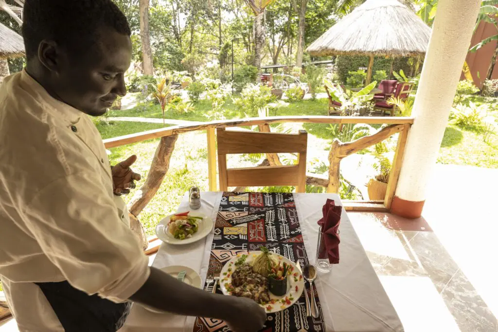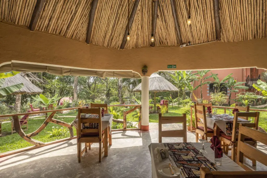 In het midden van de groene tuin met vele kleurrijke bloemen ligt het restaurant. Deze is ruim opgezet en heeft geen ramen en muren, waardoor je de rust uit de tuin ook in het restaurant ervaart. De chef maakt dagelijks de lekkerste Tanzaniaanse of andere wereldse gerechten voor je klaar in buffet of à la carte vorm. Vind je het te fris? Kom dan lekker bij de open haard zitten met je drankje.
