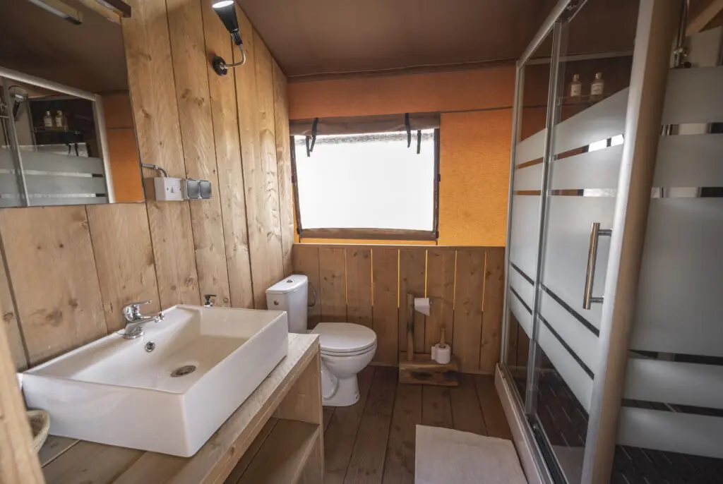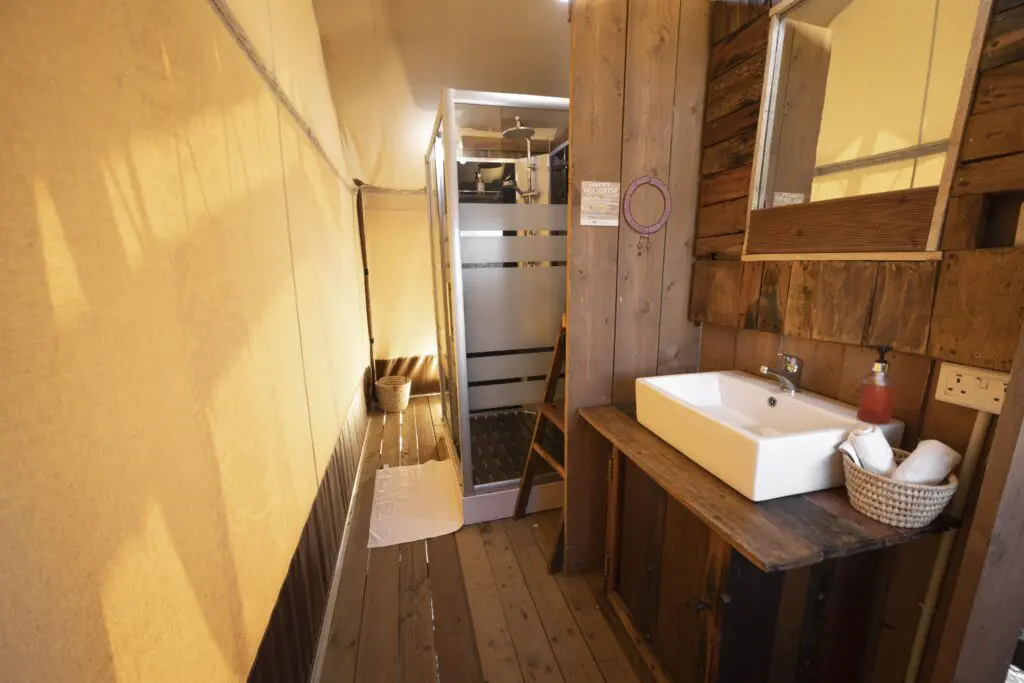 Ervaar het plezier van het buitenleven in de Safari tent met gedeelde badkamer. Perfect voor avontuurlijke reizigers die op zoek zijn naar een unieke en budgetvriendelijke optie. Deze safari tent biedt een gezellige en intieme ruimte om uit te rusten en te ontspannen midden in de natuur. Maak gebruik van de gedeelde badkamer faciliteiten, die je comfort en hygiëne tijdens je verblijf garanderen. Onze kleine safari tenten zijn doordacht en praktisch ontworpen, met 2 eenpersoonsbedden binnen en een kleine zithoek buiten.