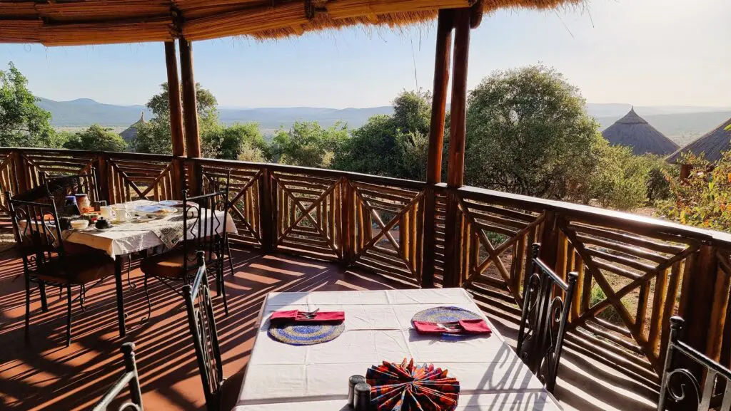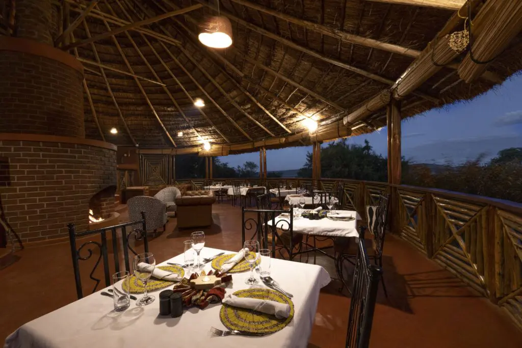 Loop de heuvel verder omhoog om het restaurant en de bar te bereiken. Je wordt hartelijk en warm ontvangen door het lokale personeel en de open haard die op koudere avonden heerlijk brandt. Het restaurant heeft een fantastische uitzicht van 180 graden over de vallei met Kenia op de achtergrond. Ervaar het met eigen ogen om ook verliefd te raken op deze magische plek.