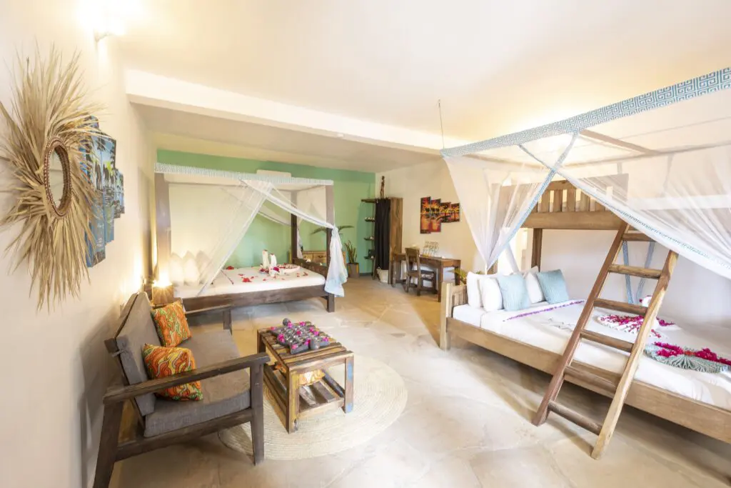 Kom jij met jouw gezin naar Zanzibar? Dan is deze familie kamer mangrove/pool view ideaal voor jullie. Het is een zeer ruime kamer in frisse kleuren met typische Afrikaanse aankleding. Het tweepersoonsbed staat los van het stapelbed voor drie personen en er kan nog een extra eenpersoonsbed bij geplaatst worden. Het zitje buiten kijkt uit over het zwembad of het mangrovebos en de badkamer is speciaal ontworpen voor families. Niks zal ontbreken tijdens je verblijf in deze kamer.