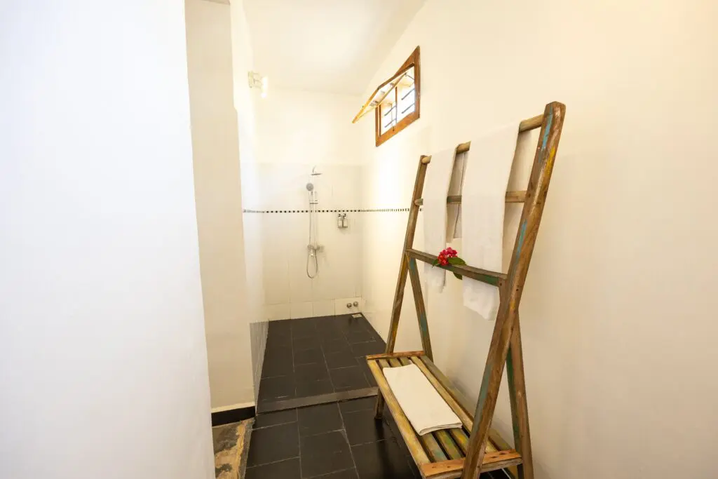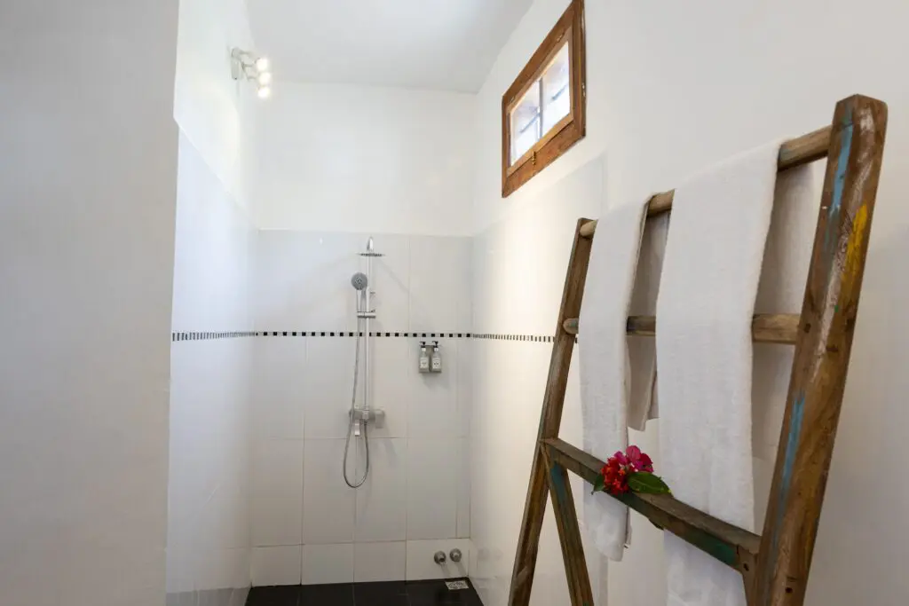 Volledig uitgeruste badkamer met föhn | Begane grond | Uitzicht op de tuin | Tweepersoonsbed of twee eenpersoonsbedden | Een extra eenpersoonsbed op aanvraag | Bureau met stoel | Airconditioning | Klamboe | Gratis WIFI | Kluisje | Koelkastje op aanvraag | Flatscreen TV | Balkon met zitje